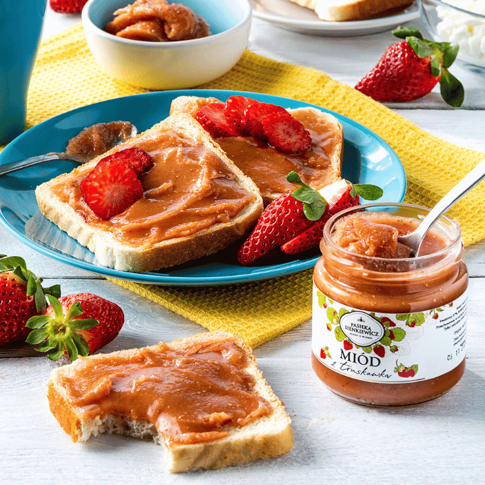 Miód z truskawką łączy łagodną słodycz miodu wielokwiatowego z naturalnym, owocowym akcentem liofilizowanej truskawki. Kremowana konsystencja ułatwia smarowanie, a świeży aromat sprawia, że świetnie sprawdza się zarówno na co dzień, jak i przy odrobinie kulinarnych eksperymentów.